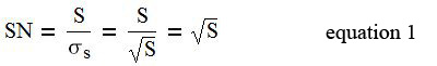 divided by the signal standard deviation. The SN is determined for an image by measuring the average value of a uniform patch and dividing by the standard deviation for the patch. The standard deviation of a Poisson limited signal is the square root of the signal. Equation (1) shows that for a Poisson limited signal the SN equals the square root of the signal.