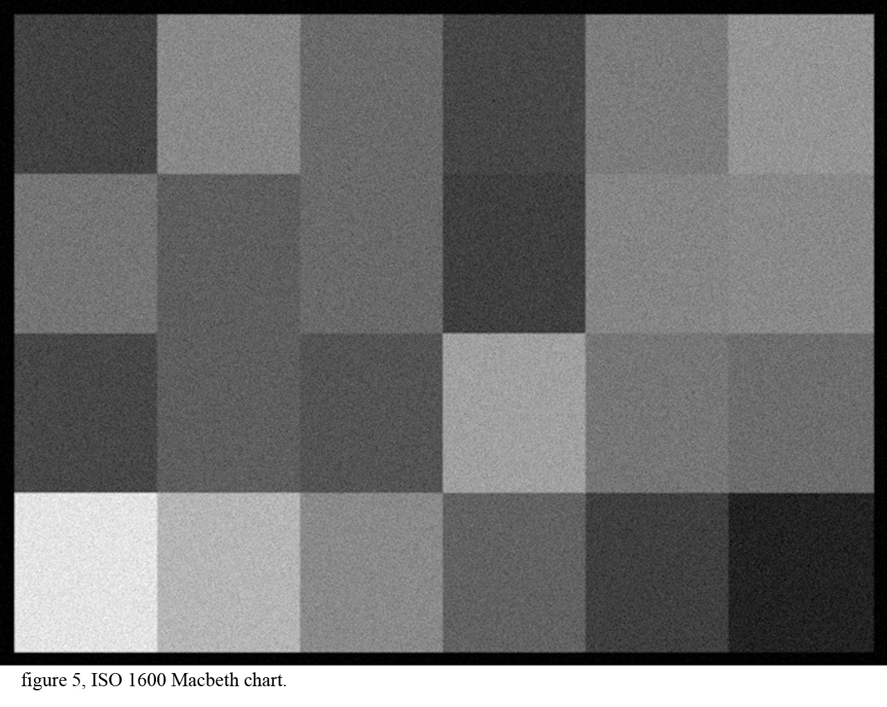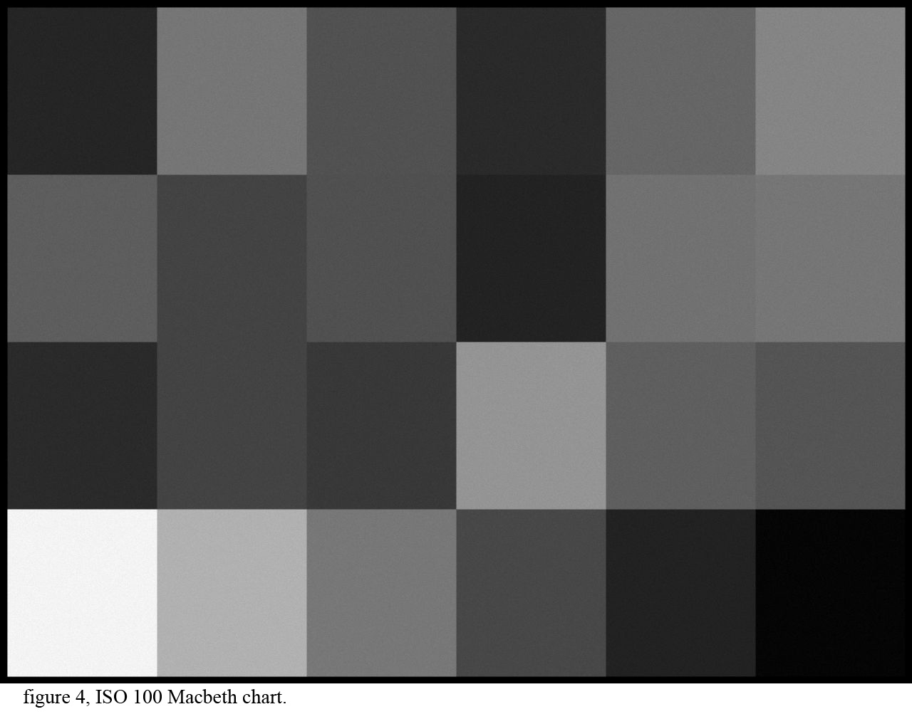 The images below are simulated monochrome images of a 24 patch Macbeth target with Poisson noise. The pixel size is 1.5 micron square. The images are 640 by 480 pixels. Notice the ISO 100 image has much lower noise than the ISO 1600 image because each pixel collects more photons at ISO 100.