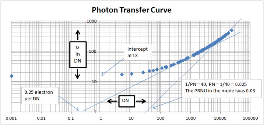 If Excel is used to create the log-log graph the margins have to be adjusted so each decade is square because many of the parameters are determined based on the slope of the line. There are two straight line slopes to the curve. The first straight line should have a slope of one half because the Poisson noise has a square root relationship to signal level. The intercept of this line with the y=1 axis is the number of electrons per digital number. Many of the remaining parameters depend on this number. The intercept at the x=1 line is the read noise in digital numbers. The read noise in electrons is determined using the number of electrons per digital number. The second line has a slope of one because PRNU noise is proportional to the signal value. This line crosses the y=1 axis at the inverse of the PRNU. PRNU is a ratio so it doesn't have to be converted to electrons.