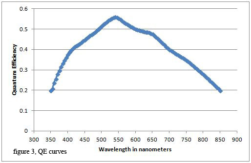 Imagers are more efficient at converting some wavelengths (colors) of light to electrons than others. The quantum efficiency (QE) curve in figure 3 shows the QE at each wavelength. Quantum efficiency is the number of electrons generated at a pixel divided by the number of photons falling on the pixel.